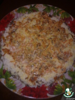 Морковь натереть на крупной тёрке и поджарить на масле. Остудить. Слить лишнее масло. Выложить третьим слоем + майонез.