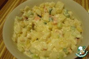 Очень сочный и яркий салатик. Сладкая кукурузка, хрустящие яблочки, сочный перчик, свежие огурчики и, конечно, ананасы))) Украсит любой стол, готовится легко и быстро! Угощайтесь!