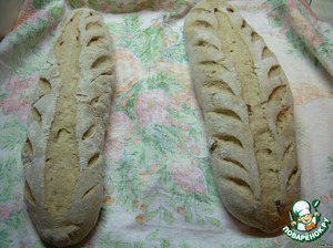 С помощью скребка выкладываем тесто на стол, хорошо подпыленный мукой, делим на две части и формируем два батона (процесс формирования такой же, как и чиабатты). Выкладываем батоны на полотенце (между батонами закладываем складку, чтобы не соприкасались), и острым ножом (я для этой цели купила в хоз. магазине нож с выдвигающимся лезвием, не знаю, как правильно он называется, лучше размещу фотографию) наносим продольную линию вдоль батона и поперечные линии.