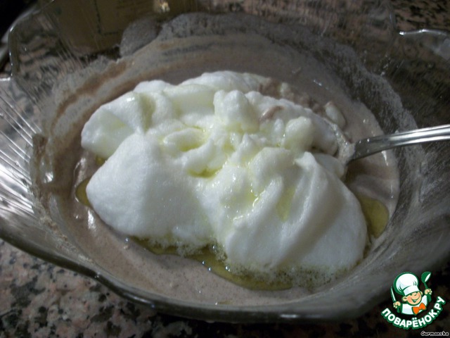 Взобьем два белка отдельно с солью и перцем, добавим их в тесто вместе с растительным маслом.
