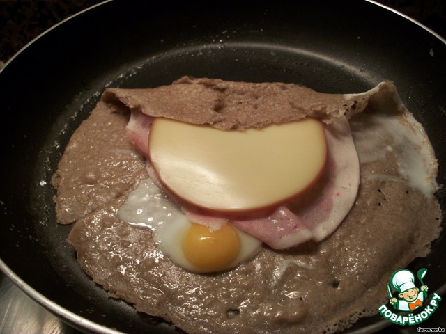 Для приготовления "Галетт" с начинкой, я выбрала рецепт "Galette Complete", который готовится с яйцом, сыром и ветчиной. Но вариации могут быть какие угодно:). Растопим немного сливочного масла на сковороде на среднем огне. Положим блин, в серединку положим тоненький кусочек ветчины, сыр (можно целиком кусочек, а можно тертый), а сверху разобьем яйцо. Делать это не совсем удобно, так как яйцо начнет растекаться и "убегать". Для того, чтобы это предотвратить, надо свернуть блинчик в конверт с 4 сторон, оставив дырочку в середине.