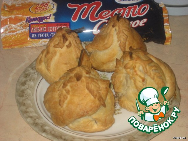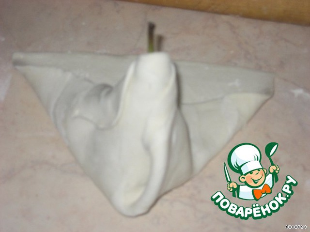 В середину квадрата поставить грушу, концы теста заворачивать вокруг груши.
