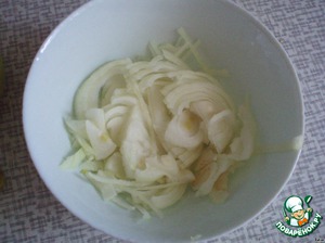 Лук режем тоненькими полукольцами. Чем тоньше он нарезан, тем вкуснее получается салат.