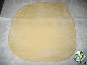 На столе расстелить чистую ткань или салфетку, хорошо посыпать ее мукой. Тесто сначала раскатывать, переворачивая с одной стороны на другую и посыпая ткань мукой. -