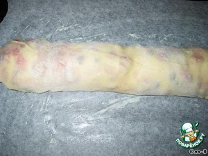 Аккуратно при помощи ткани свернуть в рулет, держа за края перенести на противень, убрать ткань сначала с одного, а затем с другого края, концы защипнуть и подогнуть под низ.