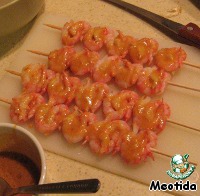 очищенные креветки плотненько нанизываем на деревянные шпажки