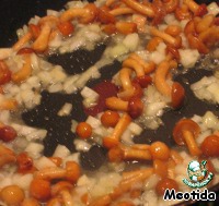 лучок измельчаем и обжариваем с грибочками в небольшом количестве масла -