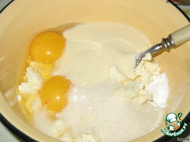 Муку просеиваем и смешиваем с разрыхлителем. Добавляем в творожную массу.