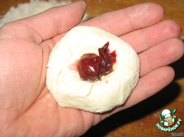 На подпыленную доску выкладываем ложкой тесто. Аккуратно подмешиваем в муке, затем делаем в ладонях шарик. В середину утапливаем вишенку и формируем опять шарик, далее лепешечку. Я кладу одну ягодку, чтобы придать сырнику вишневую кислинку. Любителям погуще можно положить больше ягод. Но тогда есть вероятность вытекания сока из теста.