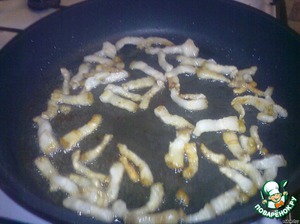 Параллельно режем тонкими полосками бекон и поджариваем.