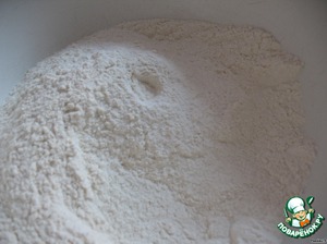 Тем временем муку просеять, добавить сахар по вкусу, одну щепотку соли.