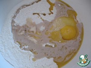 Теперь все смешиваем: смесь муки с сахаром и солью, одно куриное яйцо, дрожжи и масло.