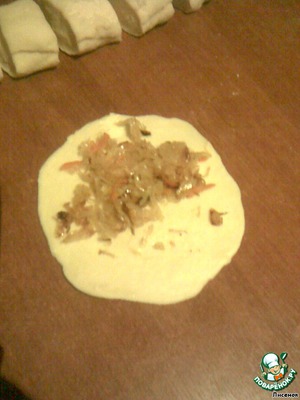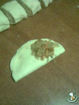 Каждый кусочек раскатываем лепешкой. На половину лепешки кладем начинку.