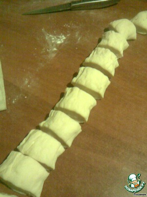 Готовое тесто скатываем "колбаской" и режем на кусочки. -