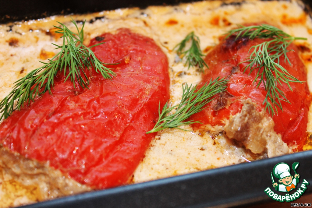 4. Перцы складываем в кастрюлю и заливаем смесью (мука, растертая со сметаной, посолить и добавить немного воды).