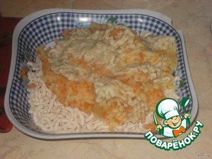 • Пропустить через мясорубку курицу, морковь, картофель и хлеб.