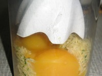 Оставшийся сыр блендером перетираем с яичными желтками в однородную массу. Белки взбиваем с солью в пышную пену. |