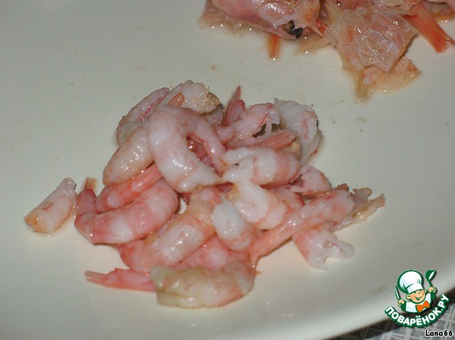 Полоску филе посыпаем сыром и кладем несколько креветок. Посолить. |