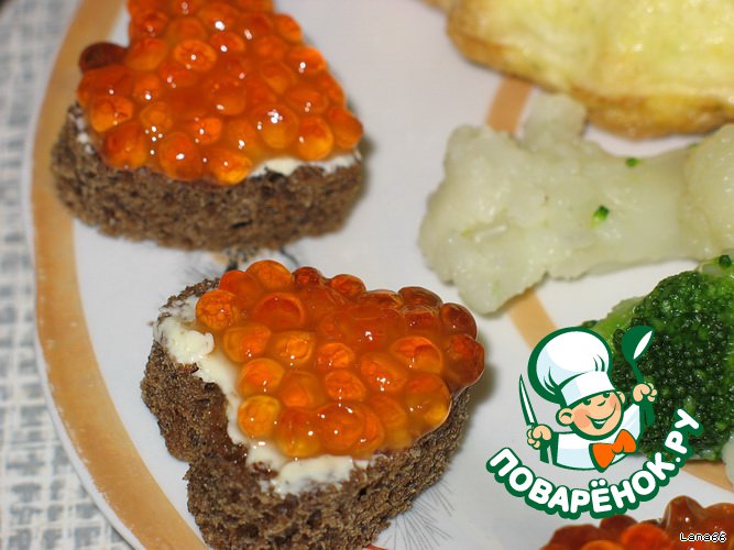 Пока готовятся валентинки, из бородинского хлеба я вырезала формочкой сердечки. Смазала сливочным маслом и красной икрой.