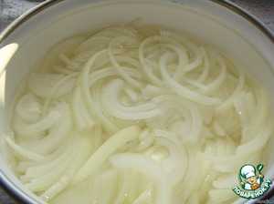 лук нарезать полукольцами и залить на 30 минут уксусом так, чтобы лук был весь покрыт - это в оригинале, но я заливаю 2/3 уксуса и 1/3 воды, тогда лучок будет не такой кислый, вобщем, это дело вкуса