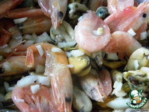 Положить в маринад мясо мидий и креветки и оставить мариноваться.