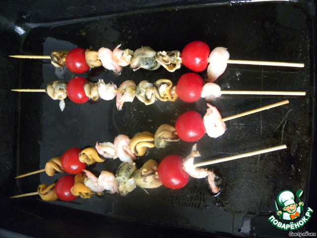 Помидоры нанизываем на шпажки, чередуя с мидиями и креветками.