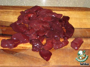 Нарезаем печень, зачищая от сосудиков. Печень лучше режется, когда она немного подморожена.
