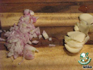 А в это время чистим и нарезаем лук, зубчик чеснока раздавливаем ножом.