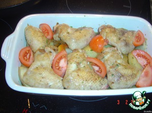 6. Овощи высыпать в форму для запекания. Сверху положить курочку и помидоры, нарезанные дольками (но лучше целые помидорки черри).