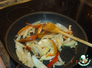 2. Лук обжарить на сковороде, где жарилась курица. Добавить чеснок.