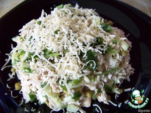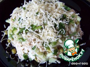 Сыр трем на мелкой терке, зелень нарезаем, оставляем примерно половину для украшения, остальное кладем в салат. -