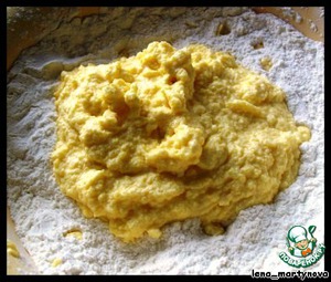 Муку смешиваем с разрыхлителем, выкладываем в неё масляно-яичную смесь и быстро замешиваем тесто.