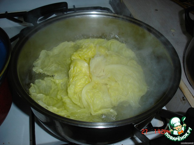 Из капусты вырезать кочерыжку, опустить в кипящую воду, сварить до мягкости.