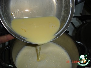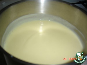Соединяем взбитые яйца с разведенной мукой, размешиваем. Из молока удаляем корицу и цедру лимона, доводим до кипения и вливаем смесь непрерывно размешивая, доводим до загустения, не кипятим, чтобы не свернулись яйца.