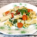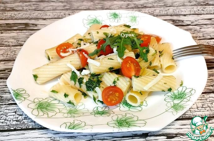 Пенне с соусом из помидоров черри с рукколой, свежей петрушкой и оливковым маслом. Хочу напомнить еще об одном простом, но замечательном рецепте.