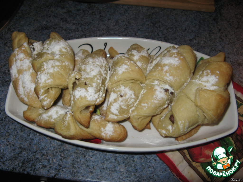 Это выпечка очень любима в нашей семье. На сайте множество рецептов круассанов, но прелесть и неповторимый вкус и аромат в начинке моих круассанов!!! Бананово-шоколадный аромат и вкус сводит с ума, и круассанчики бывают съедены еще до того, как остынут. И еще большой плюс - быстро и просто!!!