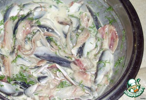 Далее готовим яичную смесь - взбиваем яйца, добавляем к ним сметану (а можно и майонез), рубленный укроп, соль и перец, по вкусу. Выливаем молоко из тюльки и заливаем яичную смесь.