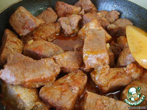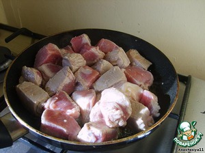 Мясо порезать крупными кубиками и обжарить на оливковом масле.