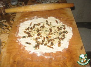 Тесто раскатать, присыпая мукой, начинку выложить поверх и вдавить хорошенько в тесто