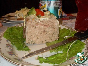 Вообще-то, это что-то вроде паштета. Название террин возникло от формы, в которой он запекается. Продолговатая форма с крышкой. У меня такой нет. Поэтому я запекала в обычной продолговатой форме, а закрывала фольгой. Голь на выдумки хитра!!! Гостям блюдо понравилось, смели подчистую!!!