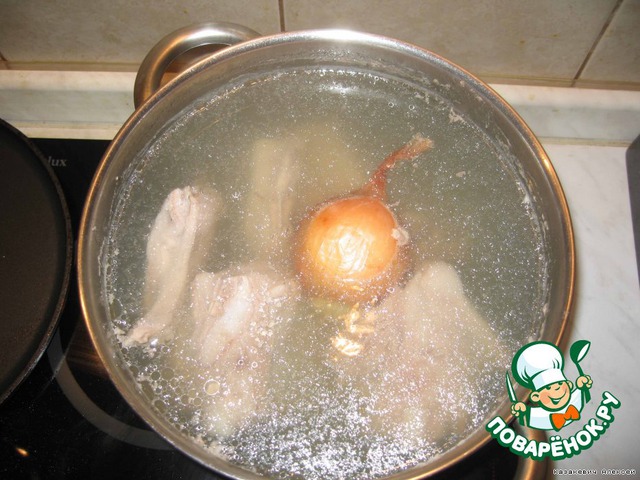 • Мясо, достаем из бульона и, отделив от костей, мелко рубим.