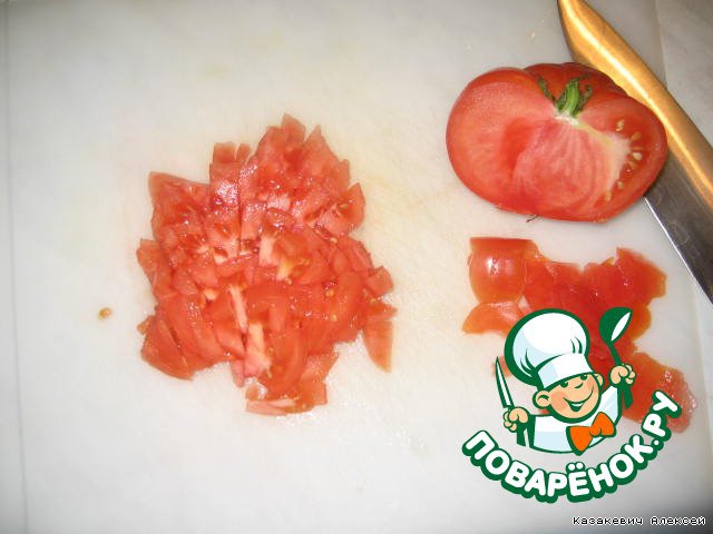 • … и мелкорубленый томат, с которого предварительно удалили кожу (для этого делаем небольшие разрезы на коже и обдаем кипятком, кожица легко удаляется обвалочным ножом). Добавляем немного бульона и на 1/3 мощности плиты тушим в течение 15 минут.