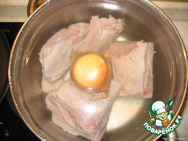 • Для начала выбираем мясо. Для приготовления любого мясного бульона идеально подходит телячья грудинка. Рубим её на 3 части и заливаем холодной водой, чтобы избавиться от лишней крови. Через 30-40 минут сливаем воду.