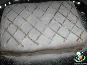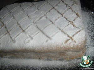 Затем с помощью скалки аккуратно переносим его на бисквит, покрываем полностью весь тортик, остатки срезаем, а верх десерта присыпаем сахарной пудрой.