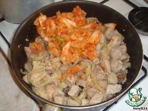 Затем туда добавляем ким-чи, обжариваем ещё минуты 3.