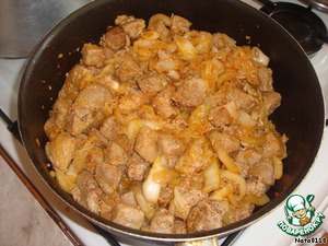На сковородочке обжариваем мяско с лучком, пока мясо не начнёт подрумяниваться. Немножко солим.
