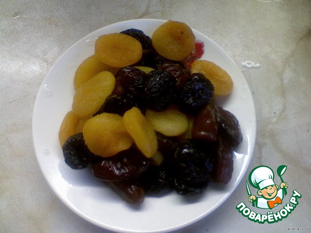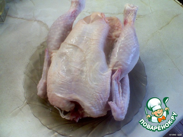Натереть этой смесью курицу снаружи и внутри, внутрь положить сухофрукты и зашить кожу (оставить небольшое отверстие для выхода пара).