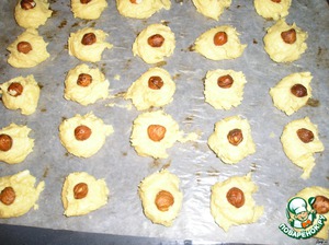 Выкладывать порции теста на смазанный маслом пергамент чайной ложкой. Возиться с кондитерским мешком не хотелось. От себя я ещё повтыкала орешки по центру.