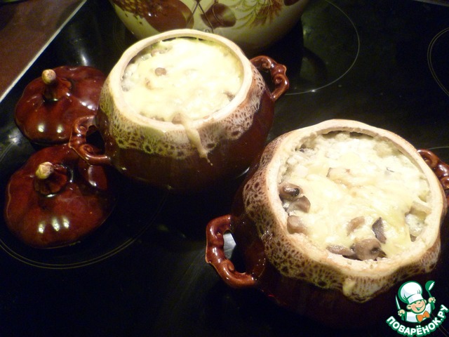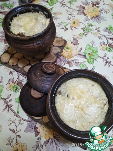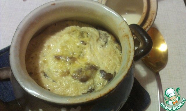 4. Заливаем полученной жидкостью содержимое горшочков, сверху посыпаем сыром.