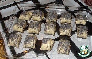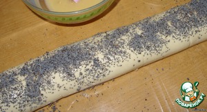 Аккуратно сверните трубочкой. Смажьте яйцом, посыпьте маком и разрежьте на кусочки шириной 3-5 см. У меня получилось 14 шт.